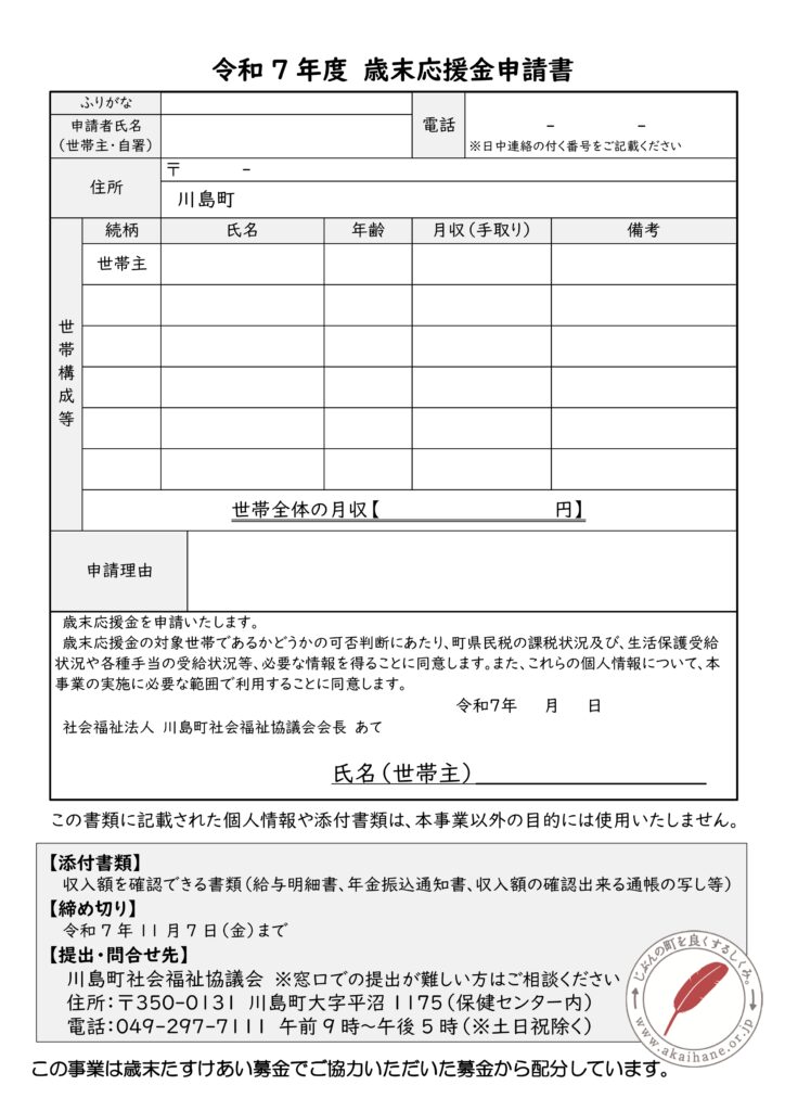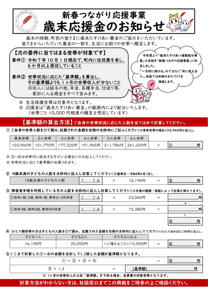 「歳末たすけあい募金」として町民の皆さまからいただいた募金の一部を、生活にお困りの世帯へ贈呈いたします。要件に該当する方で応援金の贈呈を希望される方は、社会福祉協議会へ必要書類をご提出ください(詳細は添付の資料をご確認ください)。